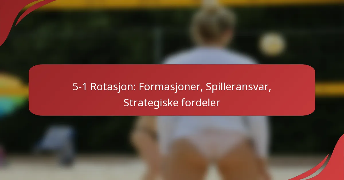 5-1-rotasjonen er en strategisk formasjon som ofte brukes i volleyball, hvor fem spillere danner en defensiv linje og én spiller fungerer som setter. For å implementere denne rotasjonen effektivt, må lag forstå spillerroller, opprettholde sterk kommunikasjon og tilpasse strategier under spill.